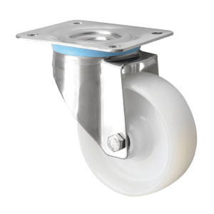 This 100 mm swivel braked castor is engineered for reliable, hygienic and smooth mobility in industrial and commercial environments. Built with a corrosion-resistant stainless-steel housing and a durable white nylon wheel, it delivers excellent wear resistance, low rolling effort and strong load performance. The integrated brake securely locks both the swivel head and wheel, ensuring complete stability when equipment is stationary.